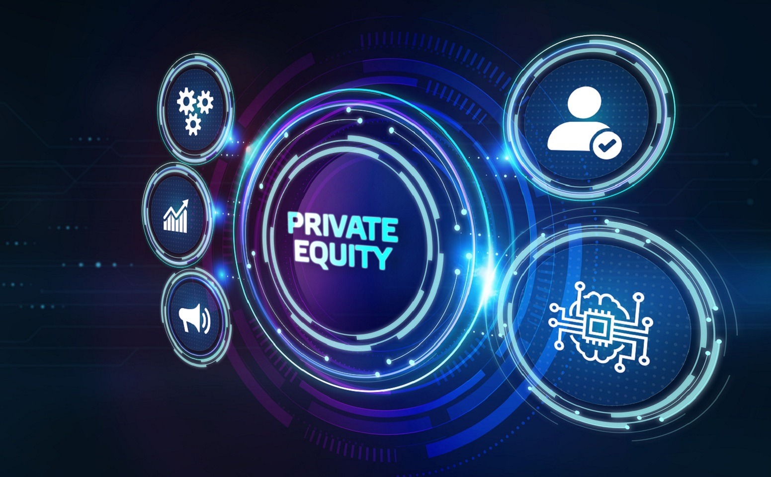 Business, Technology, Internet and network concept. Young businessman shows the word on the virtual display of the future: private equity